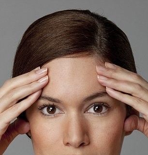 Cu ajutorul degetelor apasă pielea frunţii în jos, în timp ce încordezi şi ridici sprâncenele, creând astfel o tensiune asupra muşchilor frunţii. Repetă aceste mişcări aproximativ 30 de secunde. În cazul în care ridurile din această zonă sunt mai adânci, repetă de 3 ori pe zi