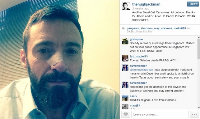 "Un alt carcinom bazocelular extirpat", explică Hugh Jackman în dreptul fotografiei postate pe Instagram. Le mulţumeşte medicilor care au realizat operaţia şi oferă un sfat tuturor fanilor săi: "Vă rog! Vă rog! Nu uitaţi niciodată de crema cu protecţie solară!".