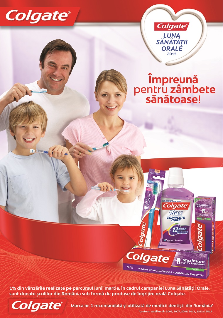 Ca în fiecare început de primăvară, Colgate a lansat o nouă ediție a unuia din proiectele sale de referință, Luna Sănătăţii Orale. Scopul principal al acestei inițiative este de a promova obiceiurile corecte pentru o igienă orală optimă în rândul consumatorilor, prin multiple activități dedicate copiilor și părinților. La fel ca în anii trecuți, Colgate în parteneriat cu medici dentiști din școlile primare și studenți la Facultatea de Stomatologie din întreaga țară, organizează acțiuni pentru copiii din clasele I-IV din România, învâțându-i pașii unei igiene orale corecte și complete. Toate acțiunile Colgate se desfășoară sub sloganul „Împreună pentru zâmbete sănătoase!”, încurajând astfel adoptarea obiceiurilor sănătoase de igienă orală pentru întreaga familie.