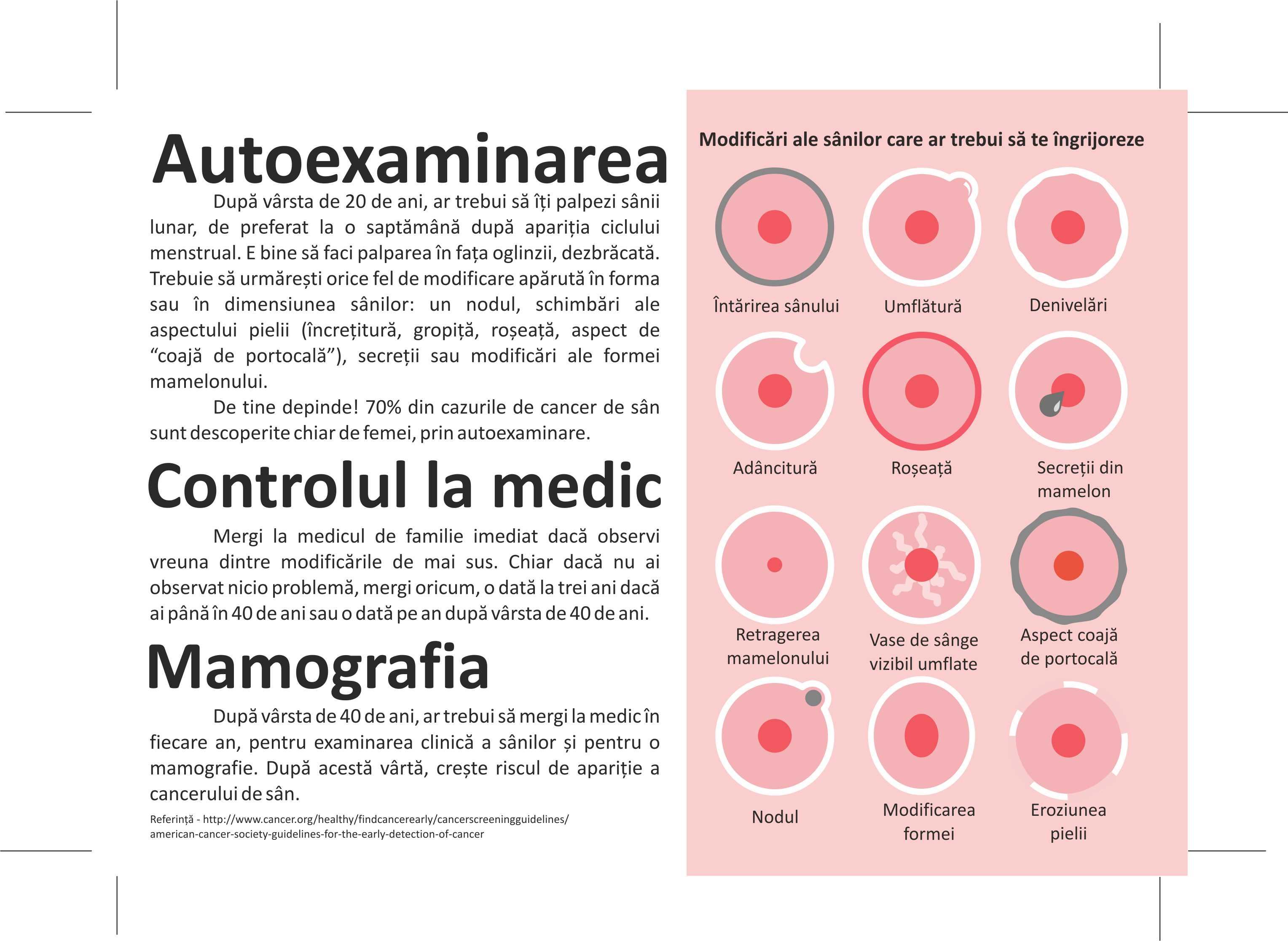 1. Autoexaminarea lunară a sanilor. Începând încă din adolescență, toate femeile ar trebui să își examineze lunar sânii, de preferat la o săptămână după apariția ciclului menstrual. Autoexaminarea se face în fața oglinzii. Lucrurile care ar trebui să le trimită pe femei imediat la medic sunt: noduli, denivelări, modificări de formă, culoare sau simetrie, plieri, mameloane întoarse înauntru, secreții.