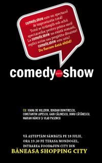 O alta surpiza pregatita de centrul comercial atat pentru cei mici, cat si pentru parinti este spectacolul Comedy.Show. Spectacolul incepe la ora 19:30 si are loc pe scena special amenajata la intrarea Food & Fun City din Baneasa Shopping City. Comedy.Show este un spectacol de teatru de improvizatie 100%. Asta inseamna ca nimic nu este pregatit dinainte, stabilit sau regizat, totul se intampla pentru prima oara sub ochii publicului care ofera sugestii la cerere actorilor (titluri de poveste, locuri unde sa se intample actiunea scenelor sau propozitii cu care actorii sa improvizeze pe loc, cele mai amuzante cantece acompaniati live de pianist). La comedy.show nu exista scenarii! Din distributie: Ioana de Hillerin, Bogdan Dumitrescu , Constantin Lupescu, Gabi Calinescu, Doru Catanescu, Marian Hancu , Vlad Pasencu.