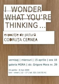 "Imaginile care constituie punctul de plecare al lucrarilor sunt deturnate de la sensul lor original, reinterpretate pentru a crea noi spatii narative, povestiri alternative.", astfel sunt descrise lucrarile Codrutei Cernea din "I wonder what you're thinking". Expozitia este deschisa pana pe 8 mai, la Galeria Mora.