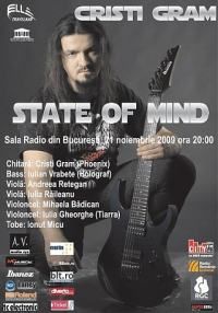 Cristi Gram, chitaristul legendarei formatiii Phoenix va concerta sambata, 21 noiembrie, la sala Radio din Bucuresti incepand cu orele 20:00. Evenimentul va marca lansarea albumului sau solo- State of mind. Artistul va fi acompaniat in concert si de un cvartet de coarde. Cristi este impreuna cu formatia Phoenix inca din 2004 si a avut contributii majore la realizarea albumului Baba Novak.