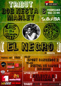 Pe data de 6 februarie, in club Suburbia, trupa El Negro va sarbatori 64 de ani de la nasterea parintelui muzicii reggae, Bob Marley, printr-un concert desfasurat sub sloganul "Love Is The Ultimate Trip". El Negro va interpreta atat piese proprii, cat si melodii celebre ale lui Bob Marley. Invitatii speciali ai trupei sunt...