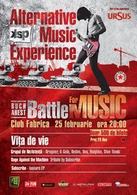 Battle for music este primul eveniment din cadrul Alternative Music Experience si aduce in prim plan pasiunea pentru muzica, reflectata prin trupele si stilurile de muzica alese, dar si de experienta asigurata de locatia binecunoscuta, club Fabrica, transformata special pentru a reda o ambianta compatibila cu tematica. Evenimentul Battle for music ii reuneste pe aceeasi scena pe cei de la Vita de Vie, Subscribe, Brugner, K-Gula, Undoo, Dox, Naighba si Stoe Toxxic.